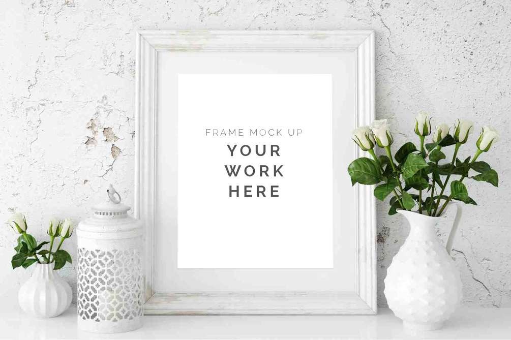 Retro style photo frame mockup on grunge wall with vintage flower vase white flowers and green leaves.
