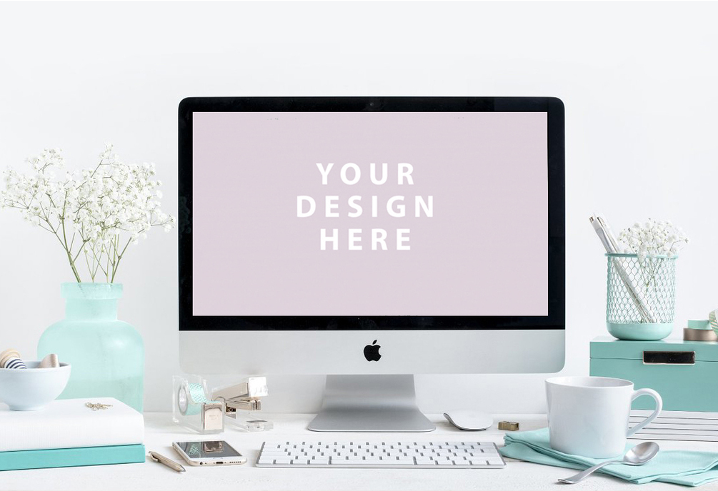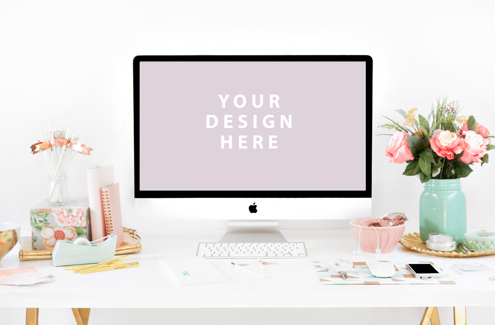Vintage style workspace scene with iMac customizable screen and glare features. You can easily change the screen placing your design with smart layers and add/remove glare.